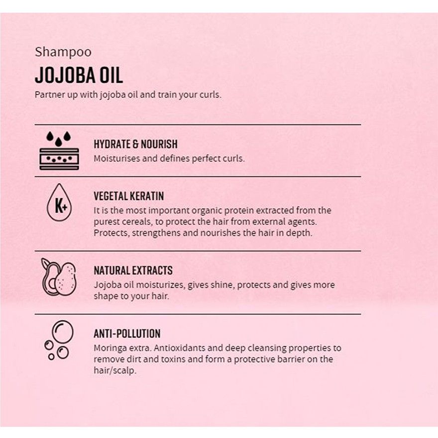 Dầu gội và dầu xả đều có chiết xuất chính từ tinh dầu Jojoba giúp cung cấp độ ẩm cho tóc, giúp tóc giữ nếp lọn tóc xoăn.